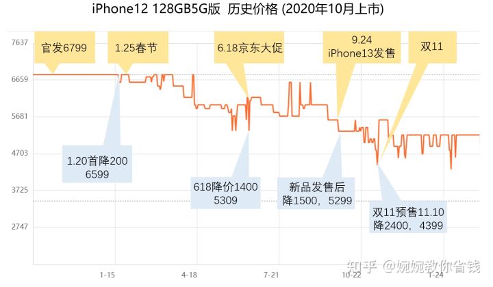 2. 以近两年iPhone12、iPhone13的降价规律为参考,总结降价规律iPhone12有4次标志性的降价活动:(1)发售之后3个月首降200,iPhone12于2020年10月发售,2021年1月20日春节前夕首次降价。